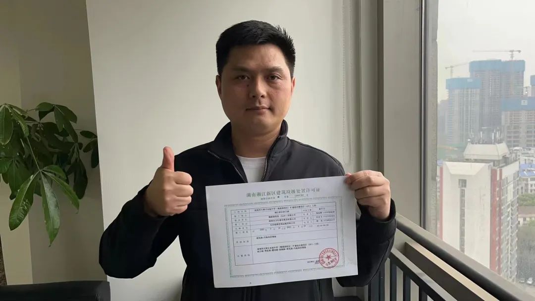 渣土运输公司的工作人员拿着许可证点赞