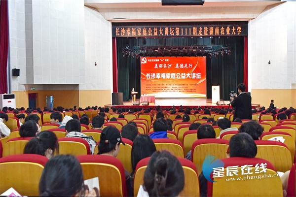 (4月7日,“美丽长沙、美德先行——长沙幸福家庭公益大讲坛”第111期讲座走进湖南农业大学。)