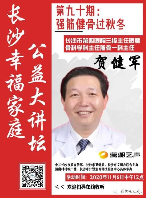秋冬季是骨关节炎高发期,保护骨关节要从日常生活做起。适宜的运动和日常营养保健是预防关节疾病的关键,也要加强对骨关节炎的认识,做到早预防,早诊断,早治疗。长沙幸福家庭公益大讲坛第90期(电台特别节目第七期)“强筋健骨过秋冬”,将于2020年11月6日中午12点,在湖南电台938潇湘之声播出,邀请嘉宾为长沙市第四医院骨科学科主任兼骨一科主任贺健军。