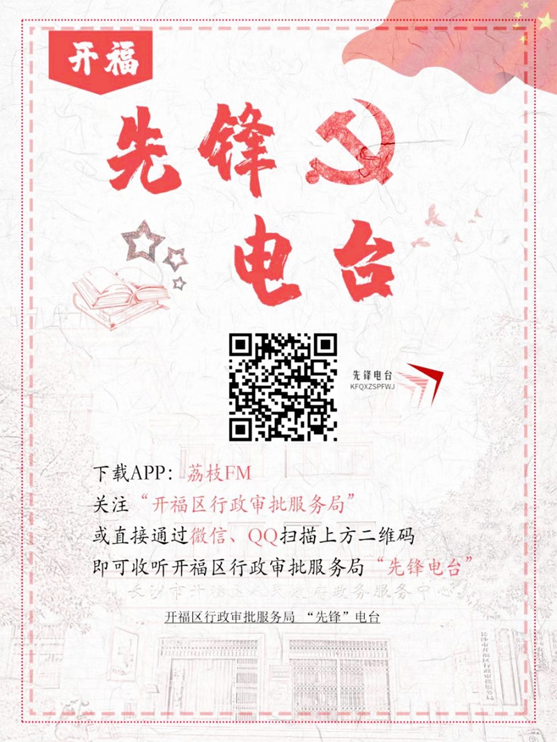 开福区行政审批服务局创新开展“不忘初心、牢记使命”主题教育,在荔枝FM上开设了“先锋”电台,成为首个以电台形式开展“不忘初心、牢记使命”主题教育宣传的单位。在这个崭新的平台上,区行政审批服务局倾力讲好履职敬业、追梦筑梦、奋斗圆梦的故事,营造政府与群众互相理解、和谐沟通的环境,让更多的人走近窗口,更多地了解开福区行政审批服务局。