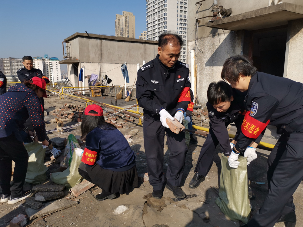 (协助社区清理居民楼顶垃圾。图片来源:开福交警大队)