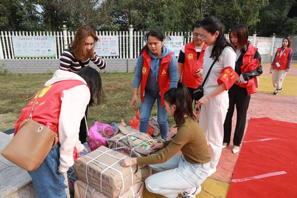 (2019年11月5日,志愿者们将精心准备的文具和学具赠送给向阳小学的孩子们。图片来源:开福区少年宫)