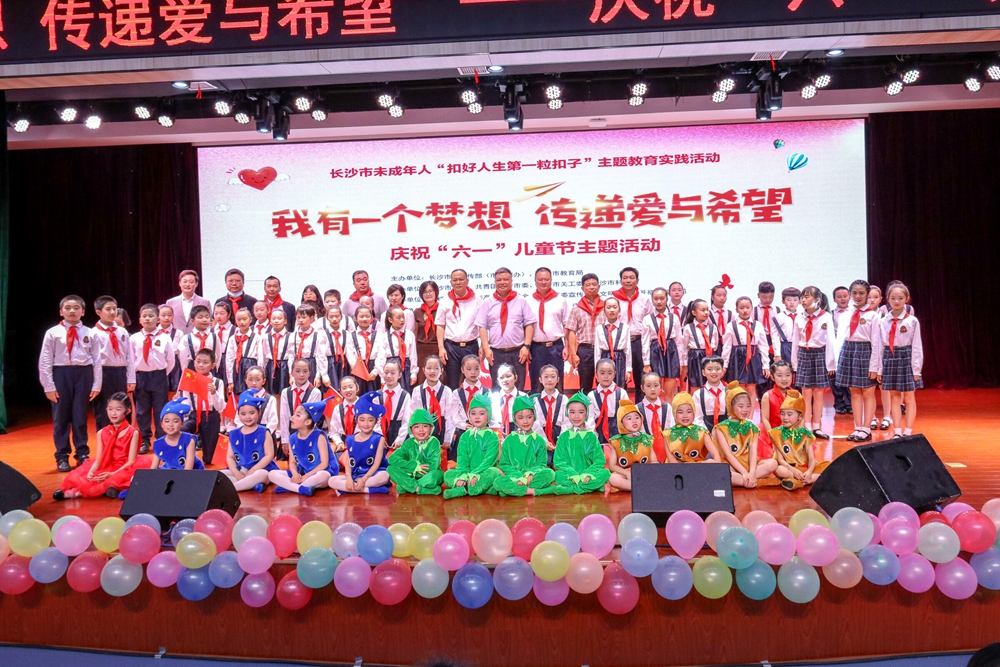 (2020年6月1日上午,开福区第一小学多功能报告厅歌声齐飞扬、掌声畅响起、幸福漾心间。长沙市未成年人“扣好人生第一粒扣子”主题教育实践活动举行。)