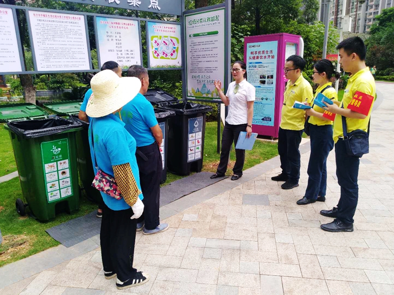 (物业小区“桶边指导员”倡导垃圾分类新时尚。图片来源:开福区住房和城乡建设局)