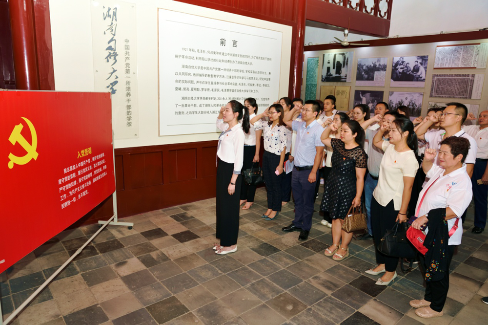 (新河街道组织党员干部参观开福区政治生活馆,并在现场重温入党誓词。图片来源:新河街道办事处)