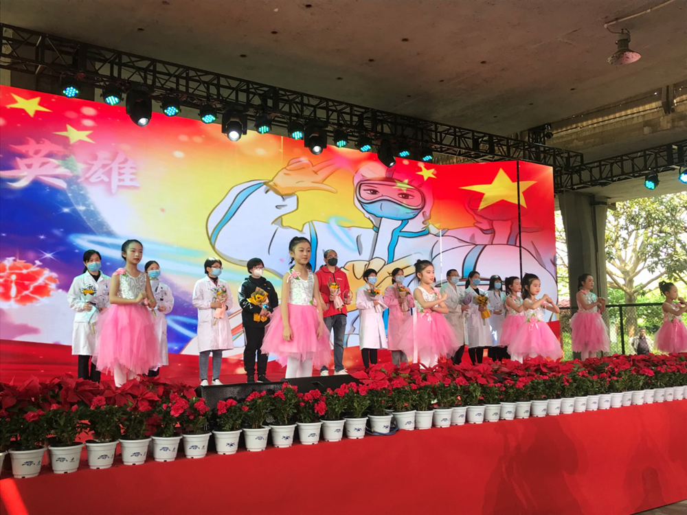 (新河街道第七届“琼花艺术节”,七届“琼花仙子”同台用歌舞将祝福献给最美战“疫”医务人员。图片来源:新河街道办事处)