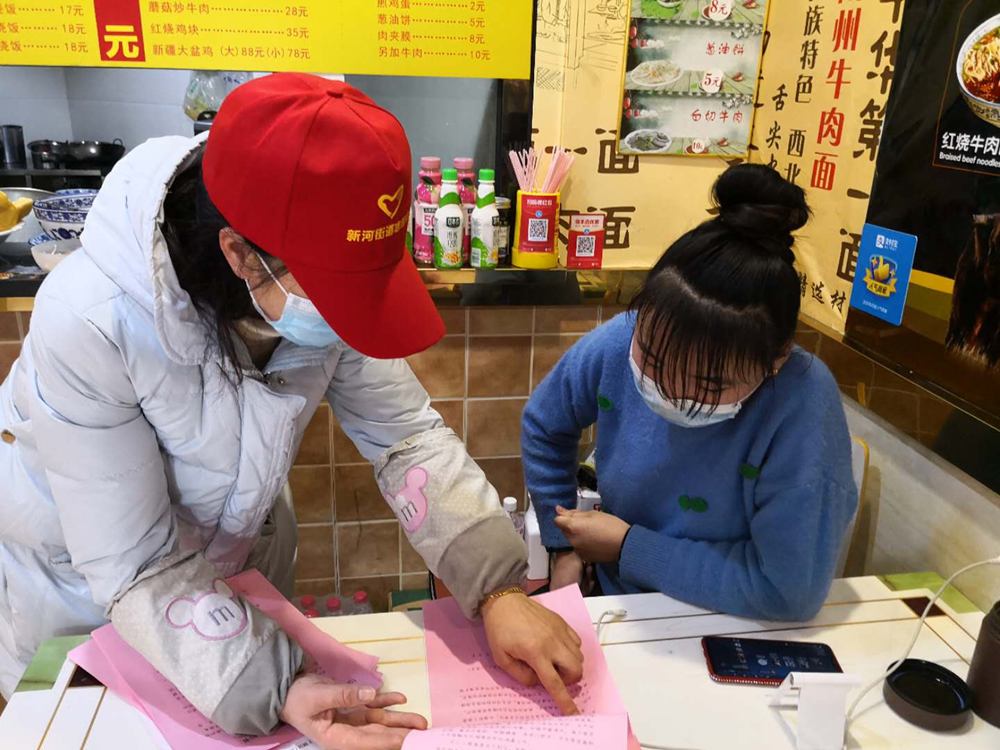 (新河街道三角洲社区工作人员向辖区餐饮门店发放“新文明餐桌”倡议书、签订承诺书。图片来源:新河街道办事处)
