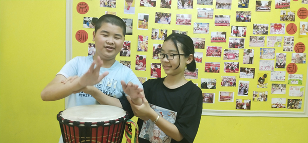 早饭后李惟繇就会出发来到恒爱之家助残公益服务中心陪小伙们。他们很喜欢音乐,李惟繇就陪他们玩非洲鼓,有她的指导孩子们玩得很开心。