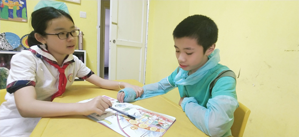 六一儿童节,天心区井岗小学的李惟繇来到恒爱支架助残公益服务中心陪伴这里的小伙伴。