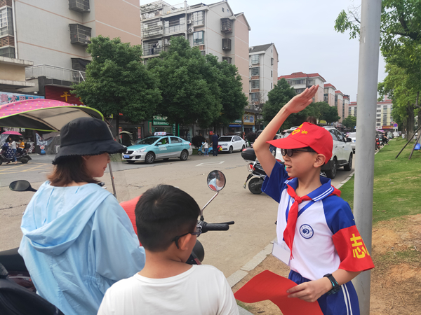 宁乡市滨江小学的苏俊羽是一名小小志愿者,在放学高峰时间,到校门口路段进行交通安全宣传和文明劝导。平时他还爱好声乐、书法、绘画……