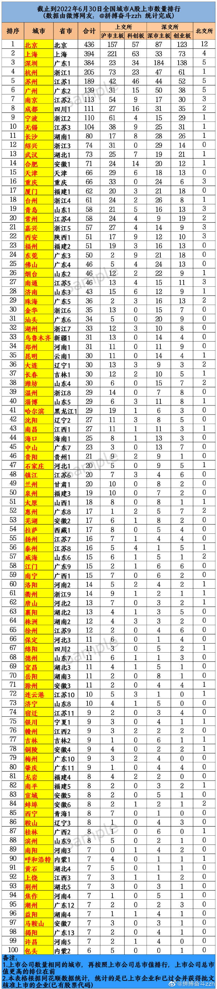 来看看截止到2022年6月30日我国A股上市公司数量100强城市榜单。