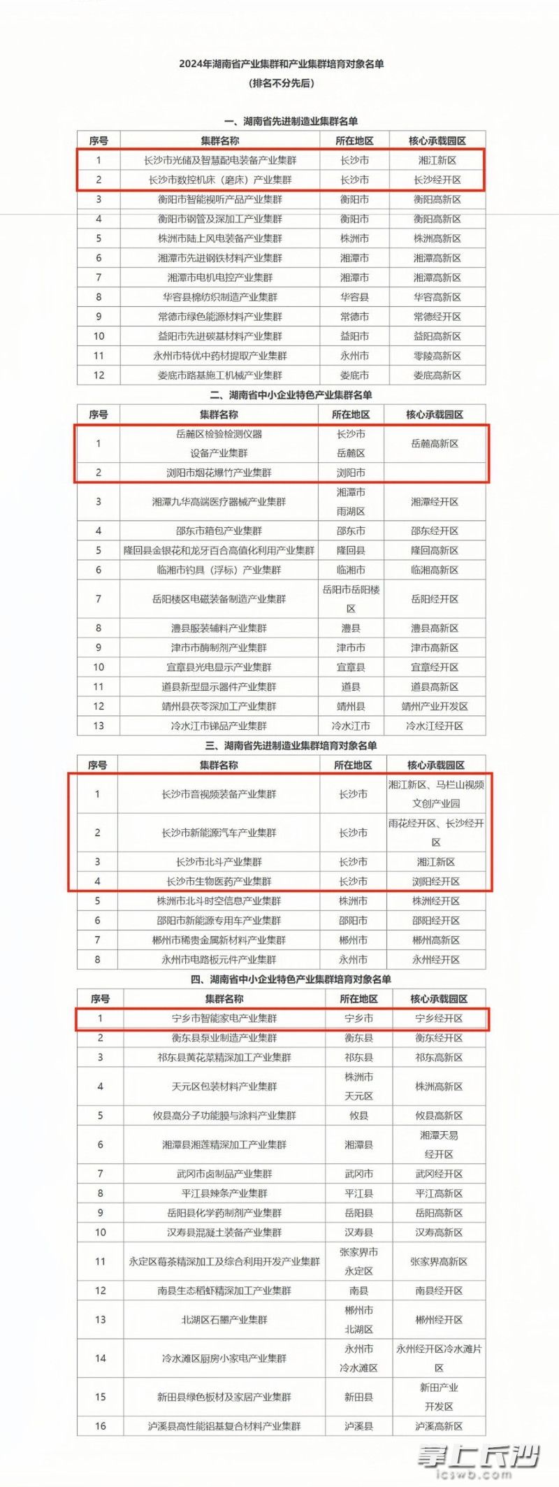 7月25日,记者从湖南省工业和信息化厅获悉,其发布了《关于公布2024年湖南省产业集群和产业集群培育对象名单通知》(简称“通知”),湖南省共新增25个省级产业集群,长沙共有9个产业集群入选。