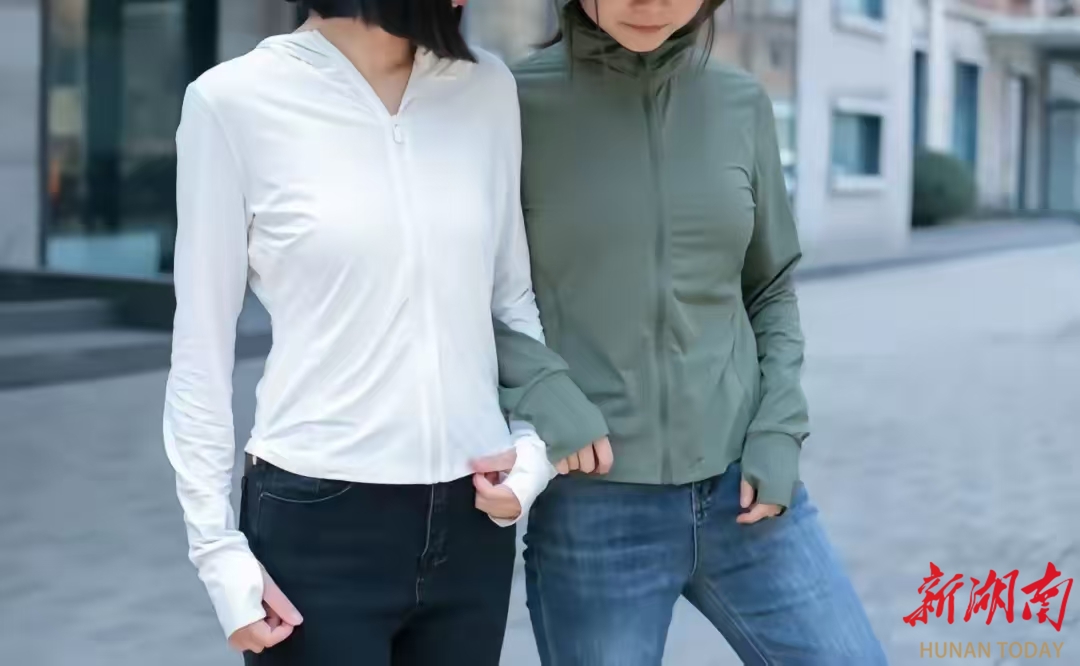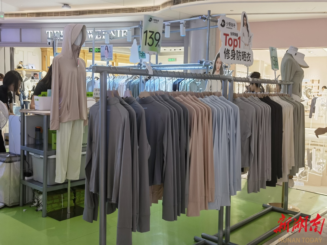 在长沙国金中心,一款修身的品牌防晒衣铺新货上架。店员告诉记者,防晒功能要好,透气凉爽,还要穿上有时尚感,“我们这几天补了3批货,防晒衣版型好,卖得也好。”