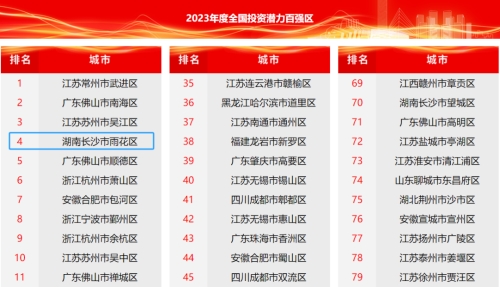 近日,中国中小城市发展指数研究课题组、国信中小城市指数研究院发布2023年度全国投资潜力百强区榜单,长沙市雨花区位列第4名,与去年相比,排名前进4位,首次进入该榜单前五,三年时间持续争先进位,稳居中西部城区第一,持续擦亮雨花区作为投资热土的金字招牌。