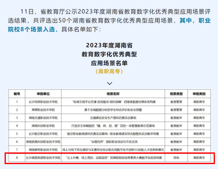 湖南日报·新湖南客户端12月20日讯(通讯员 朱明松)云上办赛、线上竞技、远程监控……这是长沙商贸旅游职业技术学院承办高职院校信息素养大赛的数字化应用场景。近日,湖南省教育厅公示了2023年度湖南省教育数字化优秀典型应用场景评选结果,全省职业院校共8个场景入选,该校名列其中。