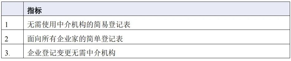 允许企业家直接以电子方式向企业注册处提交标准的企业注册文件,可以促进信息的自动验证,并降低成本。因此,市场准入主题将评估监管框架是否允许使用简单的标准表格,用于注册和更新公司信息。企业注册时,应提供给企业家标准表格,而无需寻求第三方中介机构的协助。因此,子类别 1.1.4-简单标准表格有三个指标(表6)。