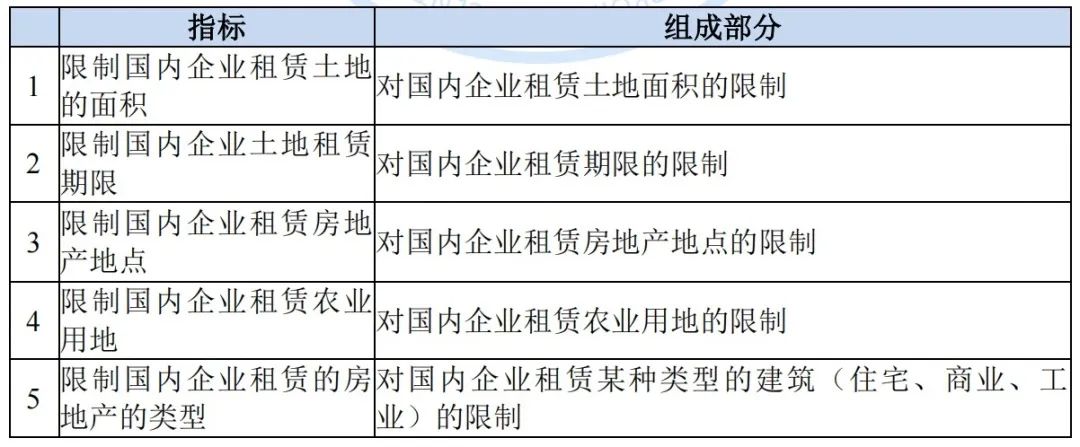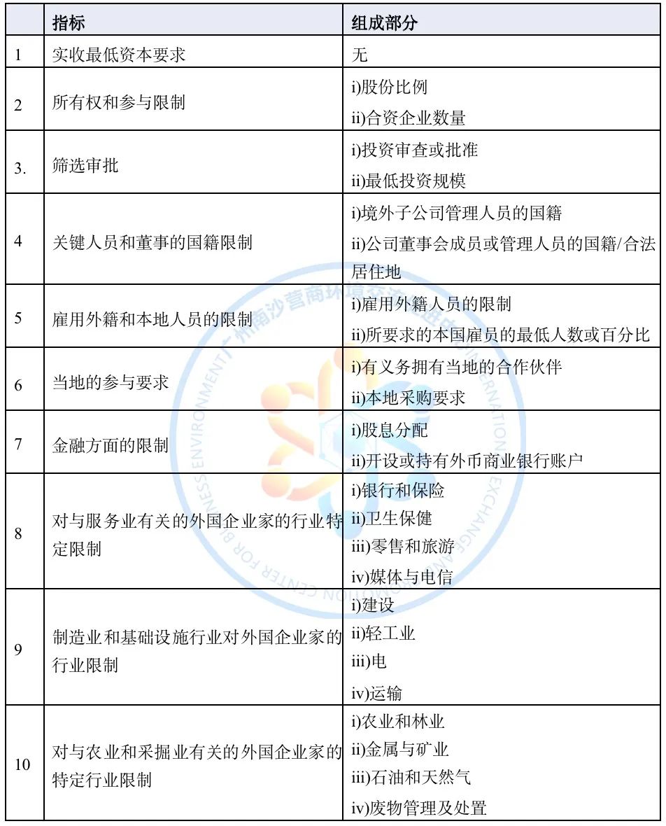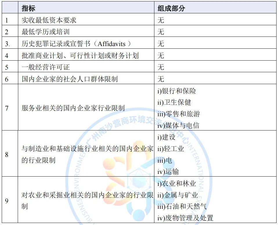 准入限制会对创业造成障碍,减少创业活动。对国内私营企业的限制可以是一般性的,也可以是具体的。例如,它们可以适用于跨部门(如要求存入最低资金量),也可以仅适用于具有特定环境影响或风险水平的活动(如某些业务或环境许可证)。同样,也有对特定行业的限制,限制国内私人参与或股权。如果某些社会人口群体的国内企业家在想要开设银行账户或开办自己的公司时面临额外的要求,也属于特殊限制。因此,子类别1.2.1 -国内企业有9个指标(表8)。