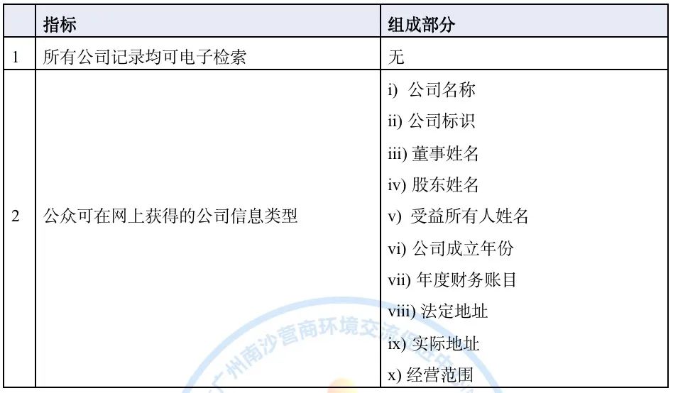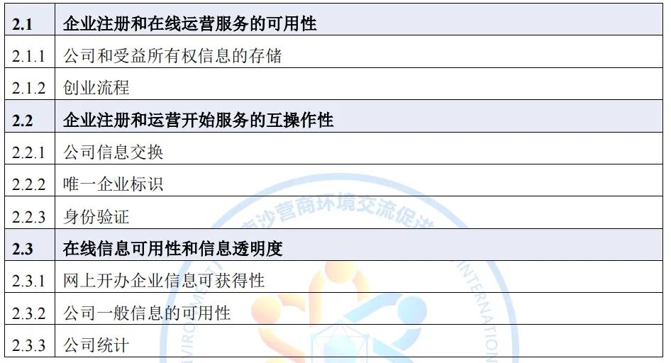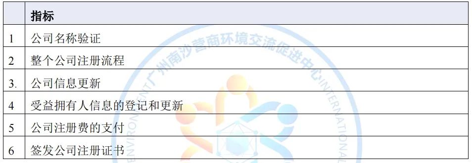 为了减少合规时间和成本,商业登记处正在扩大可以在线完成的流程数量,而无需提供文件的纸质副本或亲自访问登记处。这些流程包括公司名称的核实、费用的缴纳、税务和社保的登记,以及公司记录和受益拥有权信息的更新。商业登记处正在日益扩大和连接这类服务,使企业家能够在线完成从提交申请到接收公司文件的整个在线注册过程,包括在网上签发最终的公司注册证书。因此,子类别2.1.2 -企业启动流程有六个指标(表12)。