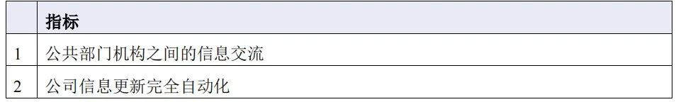 电子系统的可用性可以在参与新业务注册的机构之间交换信息(例如,商业登记、税务管理和社会保障机构),可以提高业务进入过程的效率和可靠性。通过连接或统一不同机构的数据库,可以减少出错的风险和企业家的行政负担。同样,这种信息交换简化了在企业生命周期内更新公司信息的过程。因此,子类别2.2.1-公司信息交换有两个指标(表13)。