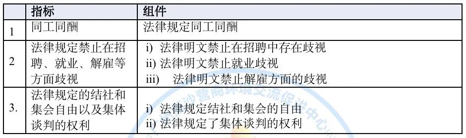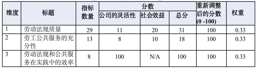类别涵盖13项指标,总分最高为15分(企业灵活性11分,社会效益4分)。具体来说,“工作时间和合同”子类别有3个指标;最低工资率子类别有1个指标;法定福利子类别有3个指标;“解雇要求”子类别有4个指标,“通知期限和遣散费”子类别有2个指标。分数是根据每个领域对企业灵活性和/或社会效益的影响来分配的; 例如,强制福利和通知期长度以及遣散费子类别的公司灵活性最高得分分别为3分和2分,但社会效益则为“不适用”,因为社会效益旨在衡量降低公司的灵活性的公司合规负担。另一方面,解雇要求子类别在企业灵活性方面最多得3分,在社会效益方面最多得2分,这可以归因于解雇的法律框架影响了企业灵活性,但也为劳工提供了保障。