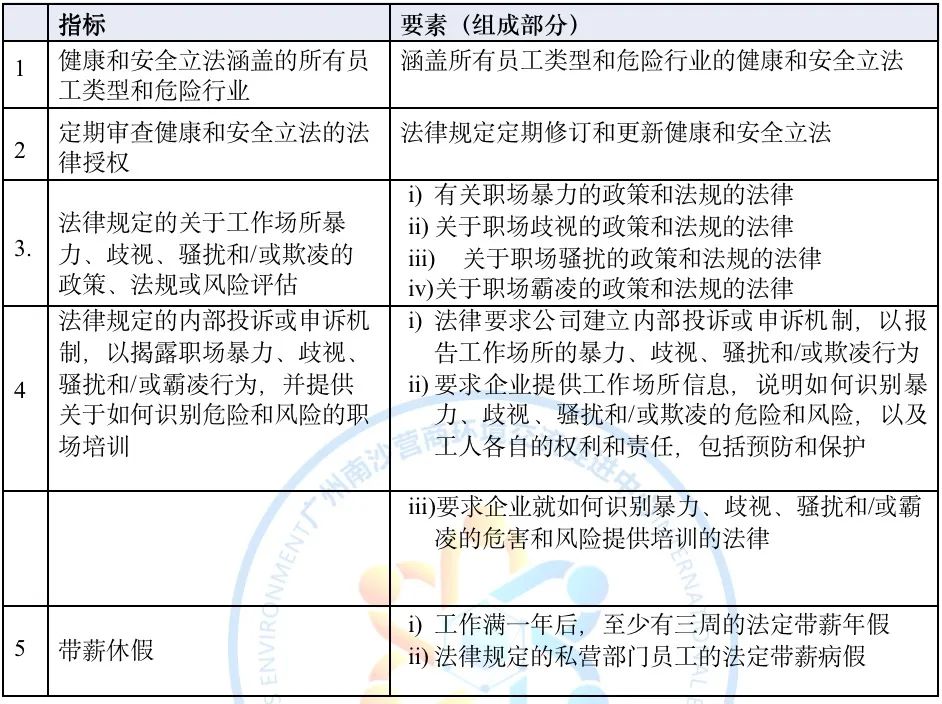 该类涵盖16项指标,总分最高16分(企业灵活性0分,社会效益16分)。具体而言,最低工资子类别有3个指标;平等、非歧视和结社自由子类别有3个指标;最低年龄和强制劳动子类别有3个指标;职业安全、健康、暴力和骚扰子类别有5个指标;通知期和遣散费子类别还有2个指标。促进劳工安全的监管框架可能会影响企业的灵活性,因此在该指标被评为“n.a.不适用”。而社会效益作为工作条件的保障,可以获得最多16分,作为指标衡量,总体上有利于劳工和社会 (社会效益)。