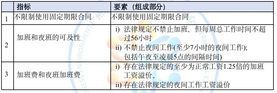 此外,当法律允许灵活的工作时间,如加班、夜班或者在一周中任何一天工作的可能性时,企业更有能力适应生产需求。只要法律通过设定工作时间的上限和确保每周24小时27的休息时间来保障工人的福祉和生产力,工人也可以通过拥有更多选择工作时间的自由而受益。因此,子类别1.2.1有三项指标(表8)。