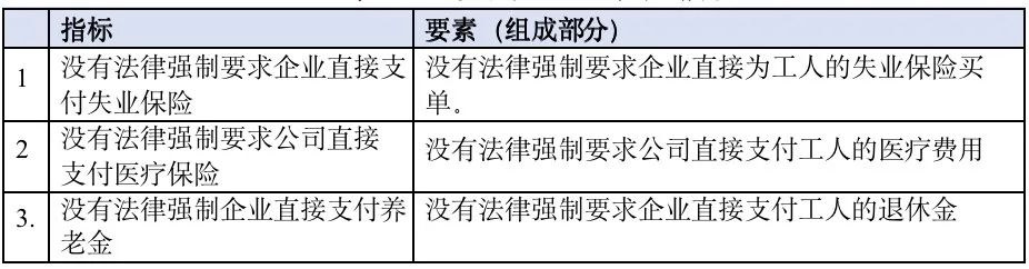 该类别涵盖6个指标,总分最高为6分(企业灵活性3分,社会效益3分)。具体而言,“失业保险”、“医疗保险”和“退休养老金”子类别共有6个指标。在这个类别,最高可获得6分,其中企业灵活性3分(来自资金来源指标)和社会效益3分(来自保险指标)。这些分数的分配考虑了衡量企业为劳工提供社会福利的成本的指标,同时确保劳工受益于失业保险、医疗保健和退休金等关键福利计划。