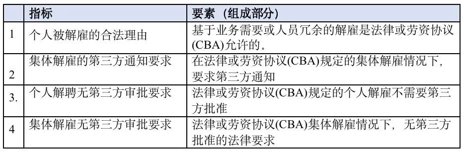 公司需要灵活地管理员工以应对商业环境的变化。一个需要明确和有效的解雇个人理由的经济体为企业提供了根据需求、市场条件或其他因素的变化快速调整劳动力的能力。因此,子类别1.2.4有四项指标(表11)。