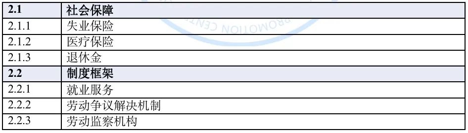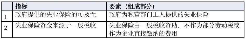 政府资助的失业保险可以对整个社会产生积极影响,因为它可以提高人力资本和生产力,并减少不平等。如果失业保险由政府一般收入而不是劳动税提供资金,将使劳工面临的成本更低,更灵活,对企业更具吸引力。因此,子类别2.1.1有两项指标(表14)。