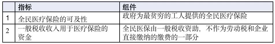 如果一个经济体提供全民(或接近全民)的基本医疗保险,并由政府一般收入提供资金,可以通过允许企业将资源重新分配到业务发展和员工工资中,从而对生产率、工作质量和工资产生直接的积极影响。因此,子类别2.1.2有两项指标(表15)。