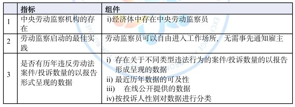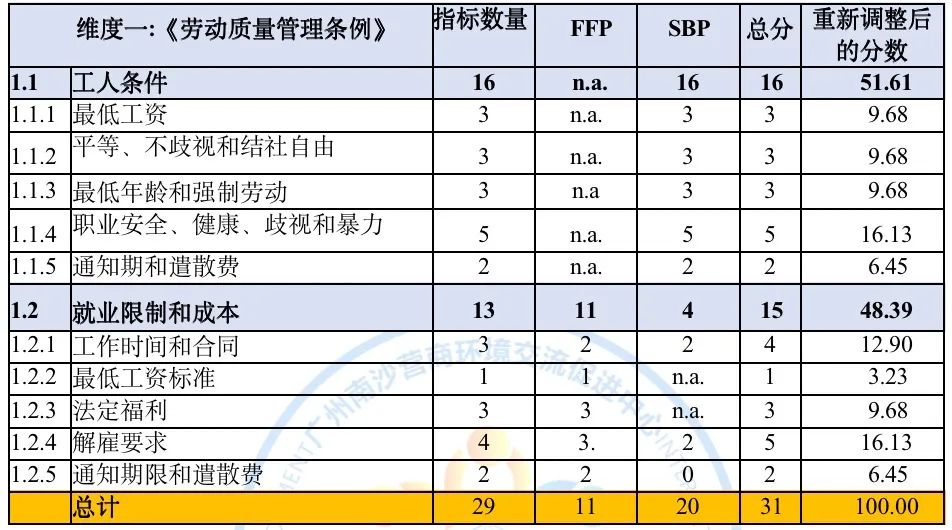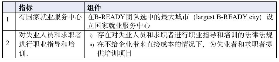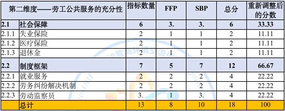 该类别包括7个指标,总分最高为12分(企业灵活性5分,社会效益7分)。具体而言,就业服务子类别有2个指标;劳务纠纷解决机制子类别有2个指标;劳动监察子类别有3个指标。在这一类别下,前两个核心指标在企业灵活性和社会效益之间平均分配——每个类别最多4分,企业灵活性2分,社会效益2分——因为就业服务和有效的劳务纠纷解决方案对劳工和企业都有利。在第三个子类别“劳动监察员”中,企业灵活性最多可得1分,社会效益最多可得3分,因为劳动监察员的任务是确保工作场所对劳工的保障——但这也可能阻碍企业的灵活性。