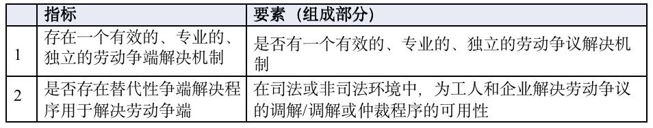 不完善的解决劳资纠纷的机制会给雇主和雇员带来巨大的不确定性,也会给家庭带来经济上的不安全感。旷日持久的诉讼阻碍了工作的再分配动态平衡和生产力。相反,一个专门的机制来解决劳动争端,以及调和(conciliation)和调解(medication)提供了一种更有效、更具成本效益和协作性的争议解决方案,可以通过在早期阶段解决冲突,帮助保持业务连续性并促进更好的劳资关系。因此,子类别2.2.2有两项指标(表18)。