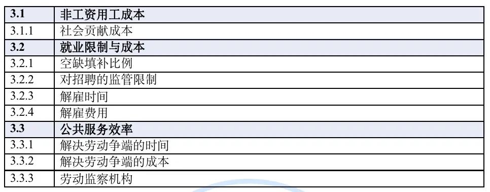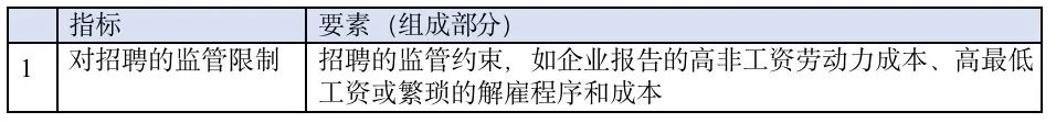 如果劳动法规使雇佣成本过高,规章过于繁琐,企业可能会选择使用更多的资本而不是劳动力,或者采用非正规的雇佣方式。因此,子类别3.2.2 -招聘监管限制有一项与企业面临的招聘监管限制相关的指标,包括较高的非工资劳动力成本、较高的最低工资成本或繁琐的解雇程序和成本(表23)。