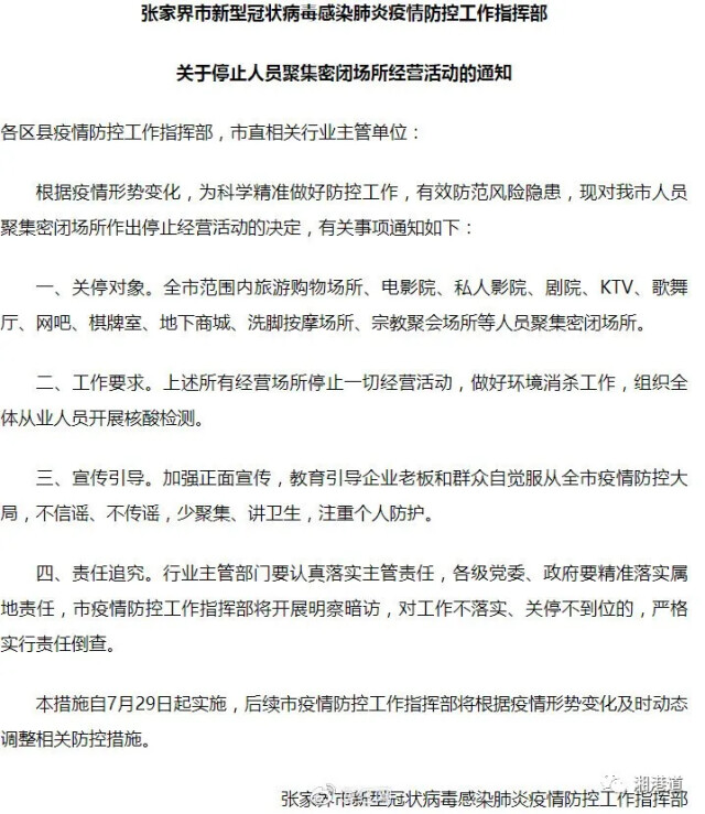 7月29日,张家界关闭全市的聚集密闭场所。7月30日上午起,张家界市所有景区景点关闭。7月30日,在关闭景区后,张家界又做出一个果断的决定:所有居民非必要不外出,所有居民小区实施封闭管理。