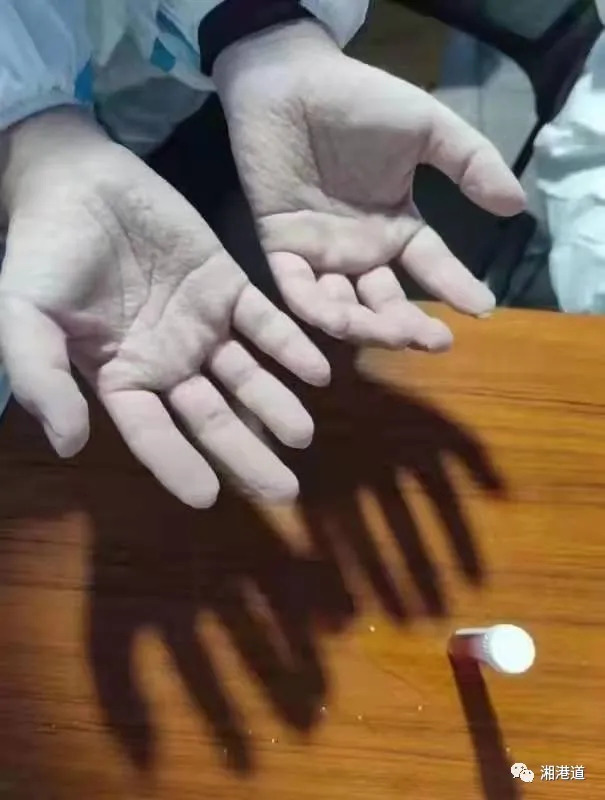 这段时间,湖南正值高温酷暑,气温高达37度以上,人们穿短袖短裤都已热得受不了,何况全身防护装备的医护人员。 医护人员一天的辛苦工作之后,脱下手套,双手已经被沤得发白、皮肤发皱,不由自主地颤抖。