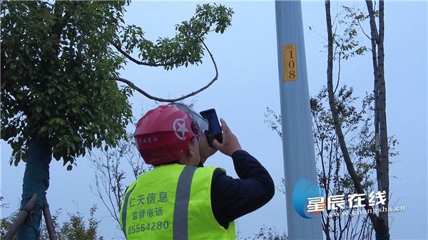 (为确保位置信息准确,信息采集员正在拍摄附近的路灯标识。)