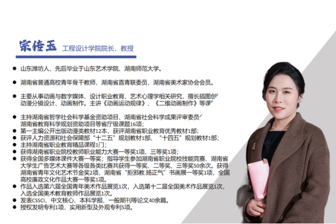长期深耕于文创产品、非遗设计、动漫游戏研究,熟悉长沙市社科领域相关政策法规,主持修订新版教学标准,推动校企合作签约龙山县惹巴妹手工织品有限公司,共建“楚怡”名师工坊和“惹巴文创产业学院”,其文创成果在“匠心文创·服务赋能”主题展中展出,并发表《高职动漫制作技术专业“工作室”教学模式探索与实践》等论文。