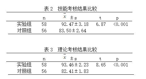 同一标准的理论考试与技能考试中,实验组与对照组的平均得分见表2(p<0.001)、表3(p<0.001),差异有显著性;其中实验组中有2位同学在全省老年照护技能竞赛中获得二等奖。