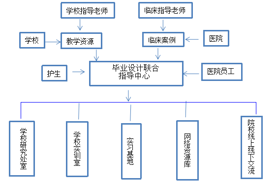 院校“双导师制”合作模式指导护生毕业设计,在于发挥双方优势资源,以提升护生毕业设计质量为出发点,培养学生的创新能力及解决临床实践问题的能力为中心,最终培养高素质的护理专业人才,因此,可以成立学校牵头的毕业设计联合指导中心,统筹学校与医院之间的合作,通过建立联合实训室、创新实践基地、网络资源数据库、院校线上线下交流论坛等途径开展,具体思路如图1所示:
