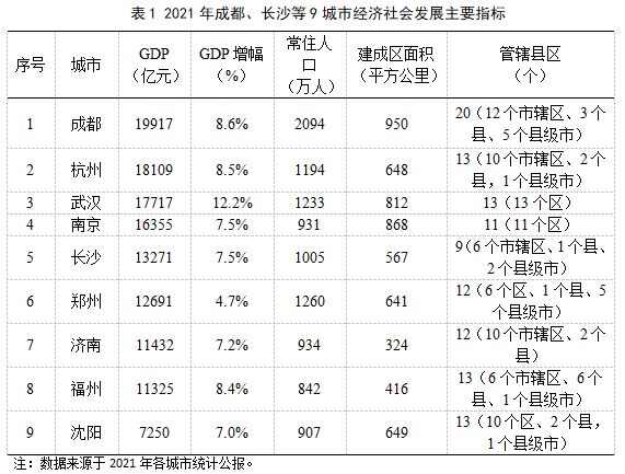 目前我国已有北京、天津、上海、广州、重庆、成都、武汉、郑州、西安9座城市被明确定位为国家中心城市。“十四五”期间,国家中心城市竞争将更加激烈,深圳、长沙、杭州、南京、福州、济南、沈阳等超过10座城市都明确提出争创国家中心城市的目标。考虑到经济体量和人口规模等可比因素,现选取国家已明确支持创建国家中心城市的成都、武汉、郑州和地方政府明确提出创建国家中心城市的杭州、南京、长沙、济南、福州、沈阳等9座城市进行经济社会发展主要指标方面的比较分析(表1)。