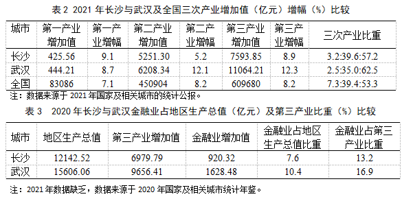 从表2可见,2021年长沙第二产业增幅低于全国3个百分点、低于武汉6.9个百分点,不到武汉增幅的一半。可见,长沙要牢固树立工业强市的理念。从表3三次产业结构看,长沙第三产业比重略高于全国平均水平,但低于武汉5.3个百分点。长沙三次产业结构不优,第三产业比重偏低。而第三产业中,长沙金融业占比又低于武汉,是“低中之低”。可见,金融业是长沙发展的短板,要加快发展生产性服务业尤其是金融业。