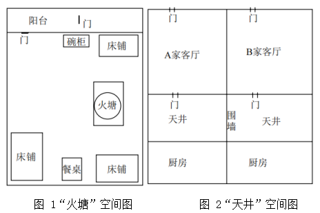 媒介人类学者郭建斌早年深入滇缅边界独龙族村寨,发现村民都集中在“火塘”观看电视(图1)。村民房子有将近三分之二以上空间都由火塘所在的房间占据,吃饭、会客、取暖等活动无一不是在火塘边进行,火塘不但是村民日常生活的中心,也是宗教祭祀唯一的核心场所。由于电视的进入,传统的火塘边的座次没有了以往严格的划分,电视成为了这个空间最核心的物件[22]。媒介科技渗入日常生活会影响乡村既有的社会传统结构,当然这绝非“科技决定论”的基调,而是提醒研究在考察媒介与场景的关系时则要探究当地的建筑特色、乡土人情与文化习俗。当笔者深入乡村家居调查时,发现多数青年群体一般都在客厅与厨房之间的“天井”里观看、拍摄与制作短视频,甚至出现与邻居听声辨人、隔空喊话的现象(图2)。