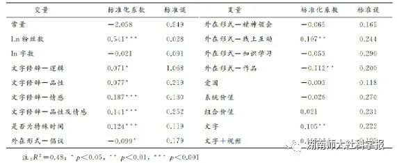 通过建立“启发—系统模型”,将高校官方微博表征属性、内容表达方法、内容价值类型作为自变量,将微博反馈量作为衡量传播效果的指标纳入回归模型作为因变量。因缺乏阅读量数据,微博用户反馈主要体现为点赞、转发与评论,社会主义核心价值观博文相关评论多以正面为主,因此在默认评论情感极性的基础上认为点赞是直接表现受众情感的举动,赋值1;转发动因源于对博文的分享,赋值2;而评论是用户的主观表达,更能表达用户对于博文的参与程度,赋值3。故基于传播有效性分析,本文的因变量计算公式为传播效果=点赞数×1+转发数×2 +评论数×3。本研究数据由2名专业编码员完成,信度最低值高于0.8,达到内容分析的信度要求。通过多元线性回归分析,文章得出回归结果,见表2。对于社会科学统计结果而言,回归模型R2高于0.5即表明该模型具有较强解释力,本模型R2为0.48,接近0.5,因此具有较强解释力。