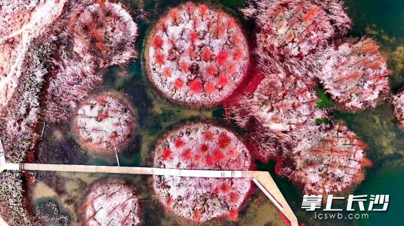 长沙晚报掌上长沙1月21日讯(全媒体记者 贺文兵 通讯员 龙宇)今日,雪落星城,望城大泽湖近自然湿地公园覆上轻纱,静谧中透着灵动。湖心树岛上红白相映煞是好看,勾勒出湿地雪韵的诗意画卷。