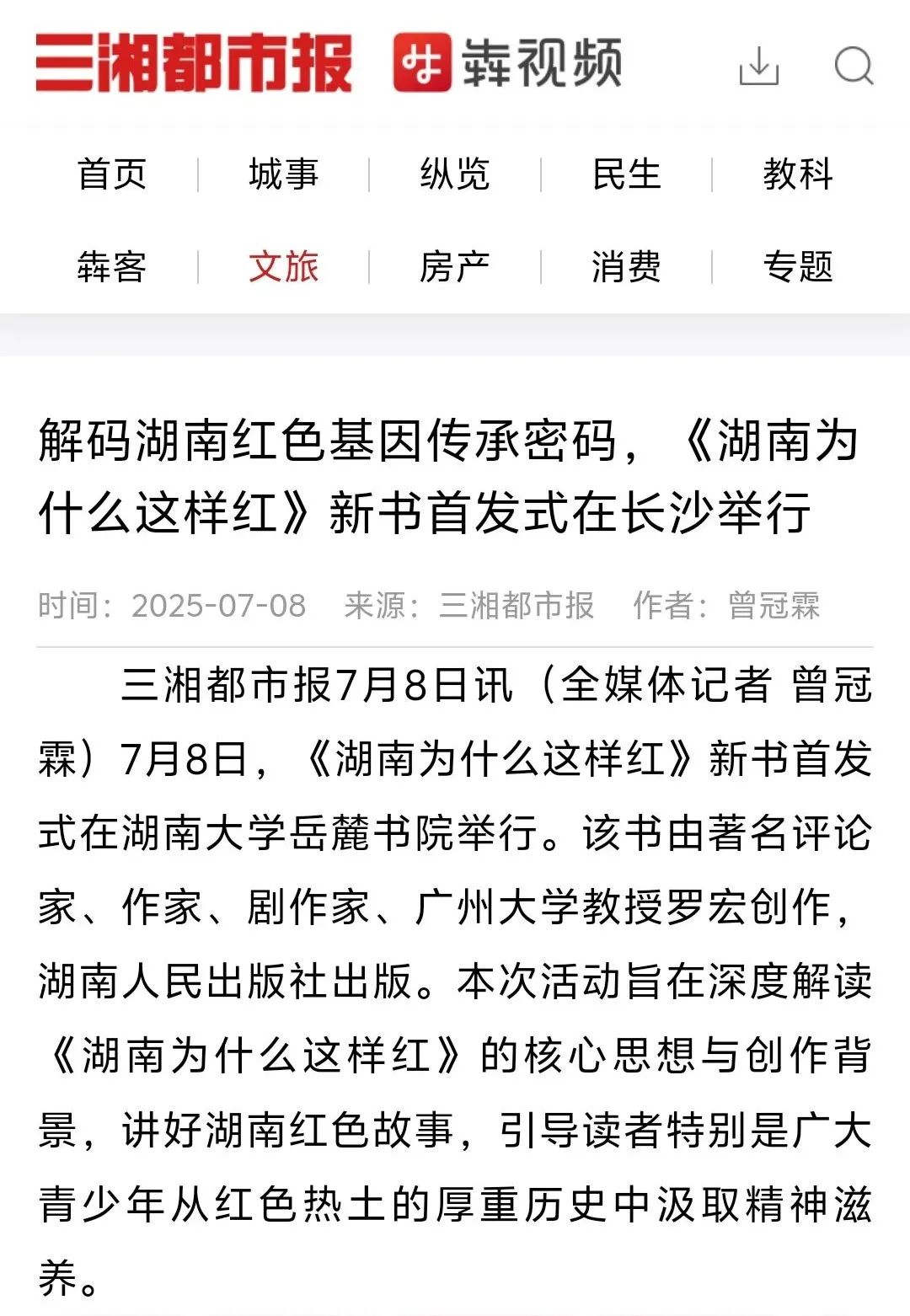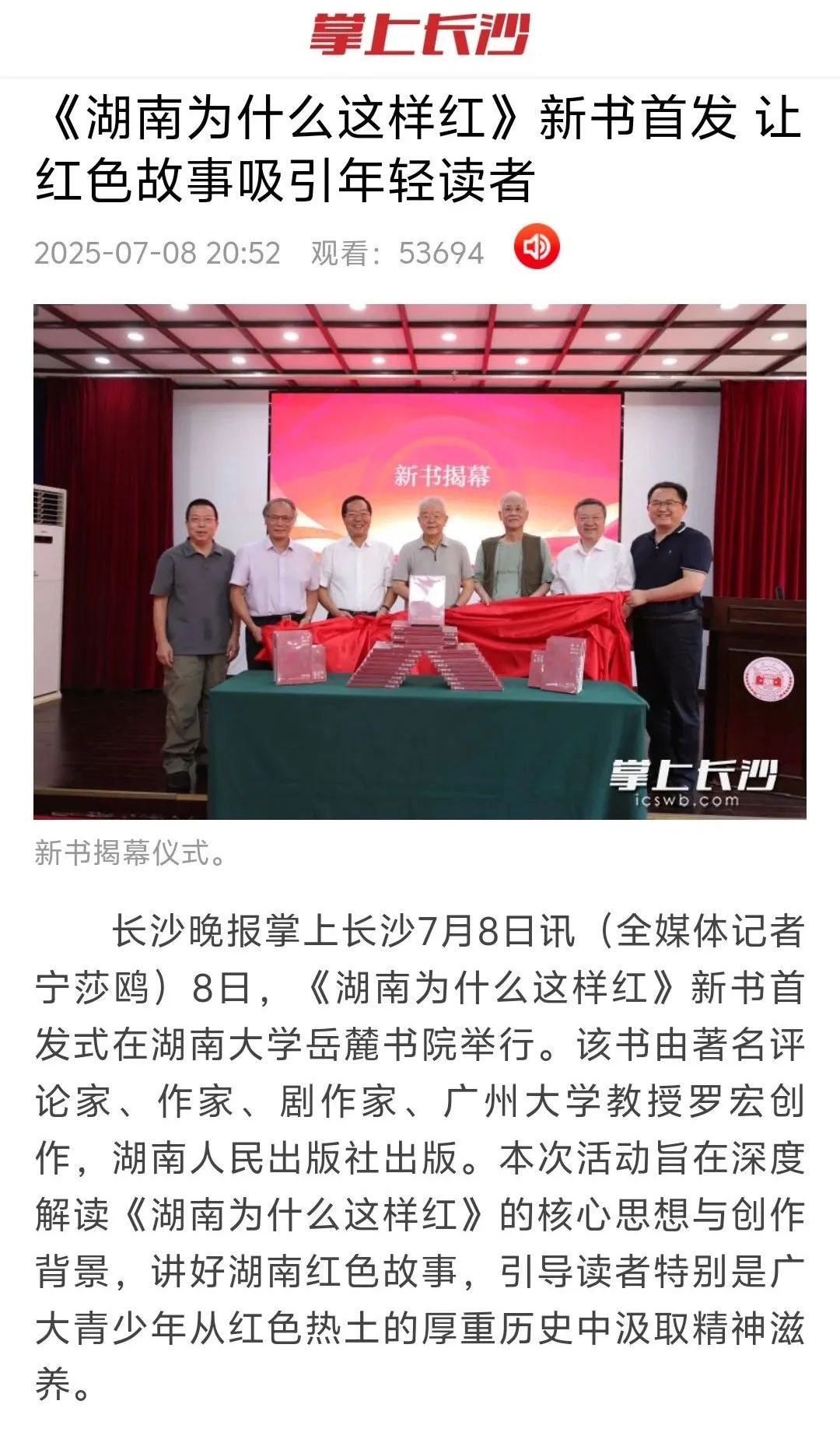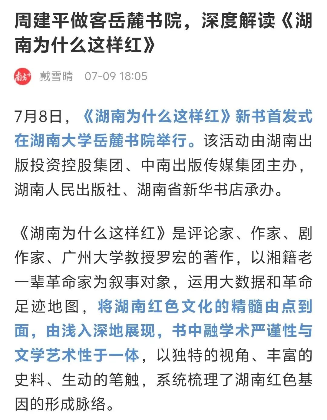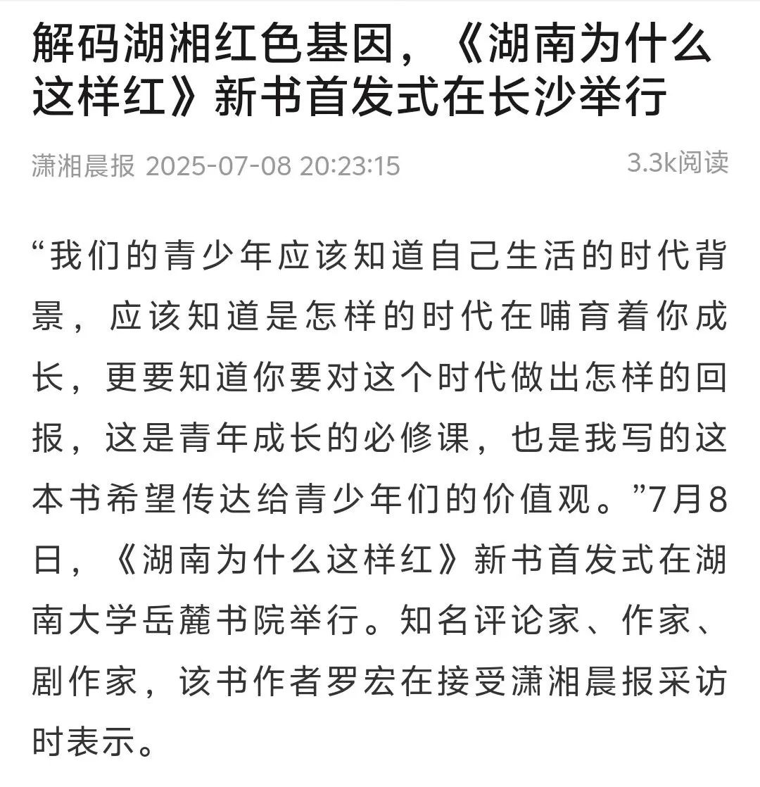 7月8日,《湖南为什么这样红》新书首发式在湖南大学岳麓书院举行。该书由著名评论家、作家、剧作家、广州大学教授罗宏创作,湖南人民出版社出版。会上,专家学者对《湖南为什么这样红》的出版给予了高度评价,一致认为该书立意角度新颖,聚焦湖南丰厚的革命历史资源,从历史纵深和文化根基出发,顺应推动湖湘文化创造性转化、创新性发展之势,系统探寻湖南为什么这样红的历史逻辑、理论逻辑与实践逻辑。该书不仅是湖南厚重革命文化的一个生动注解,更是加强革命传统和爱国主义教育、赓续红色血脉的一本鲜活教材。活动获得了《国际日报》、《湖南日报》、《南方日报》、湖南经视、红网、《潇湘晨报》、《长沙晚报》、星辰在线等国内外主流媒体的广泛报道。