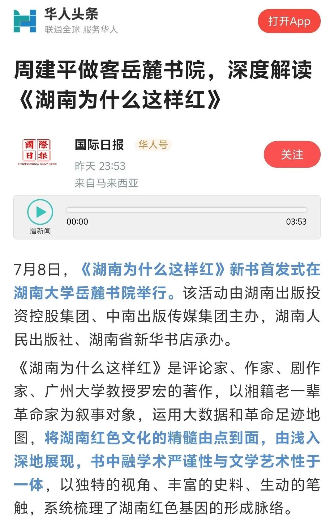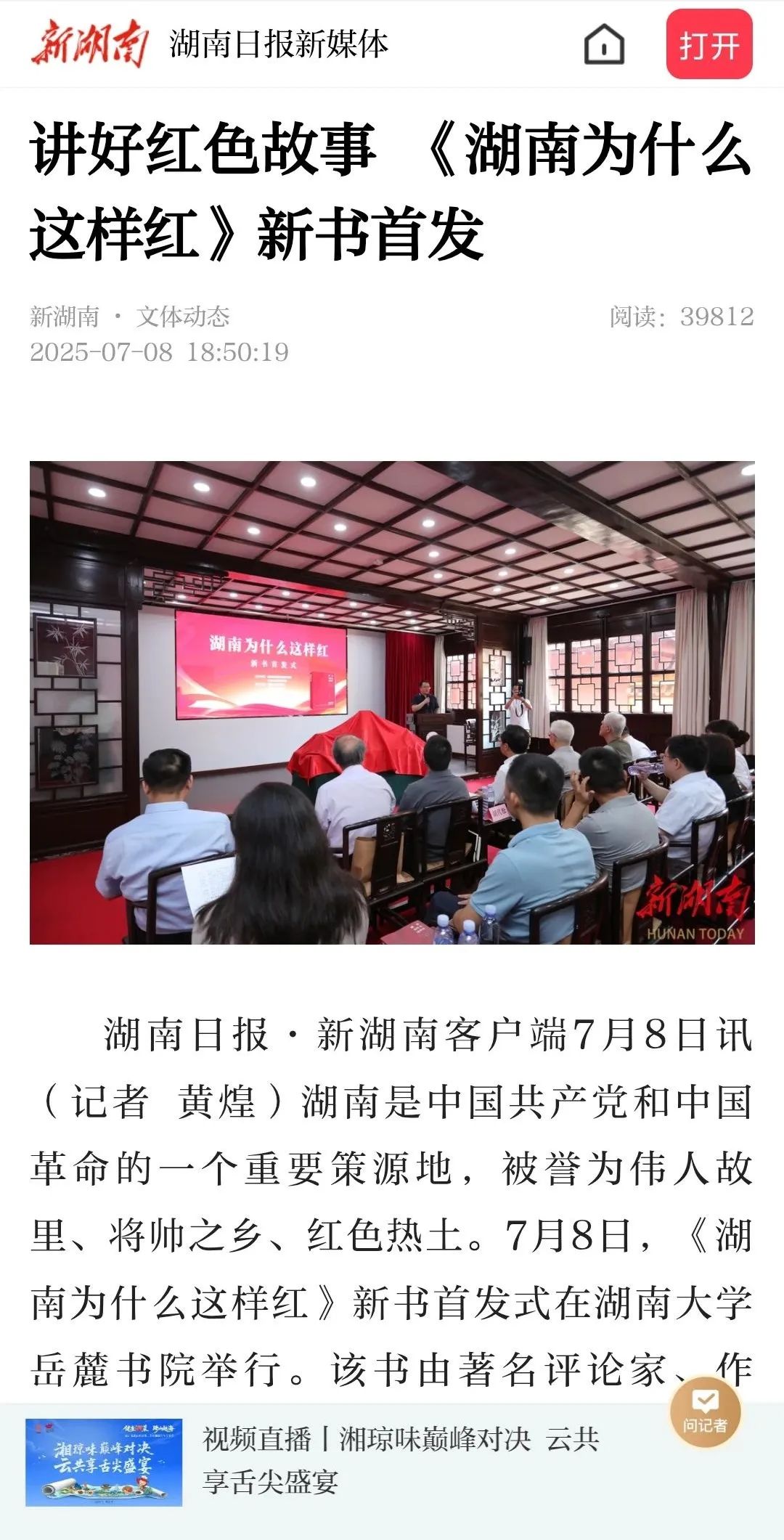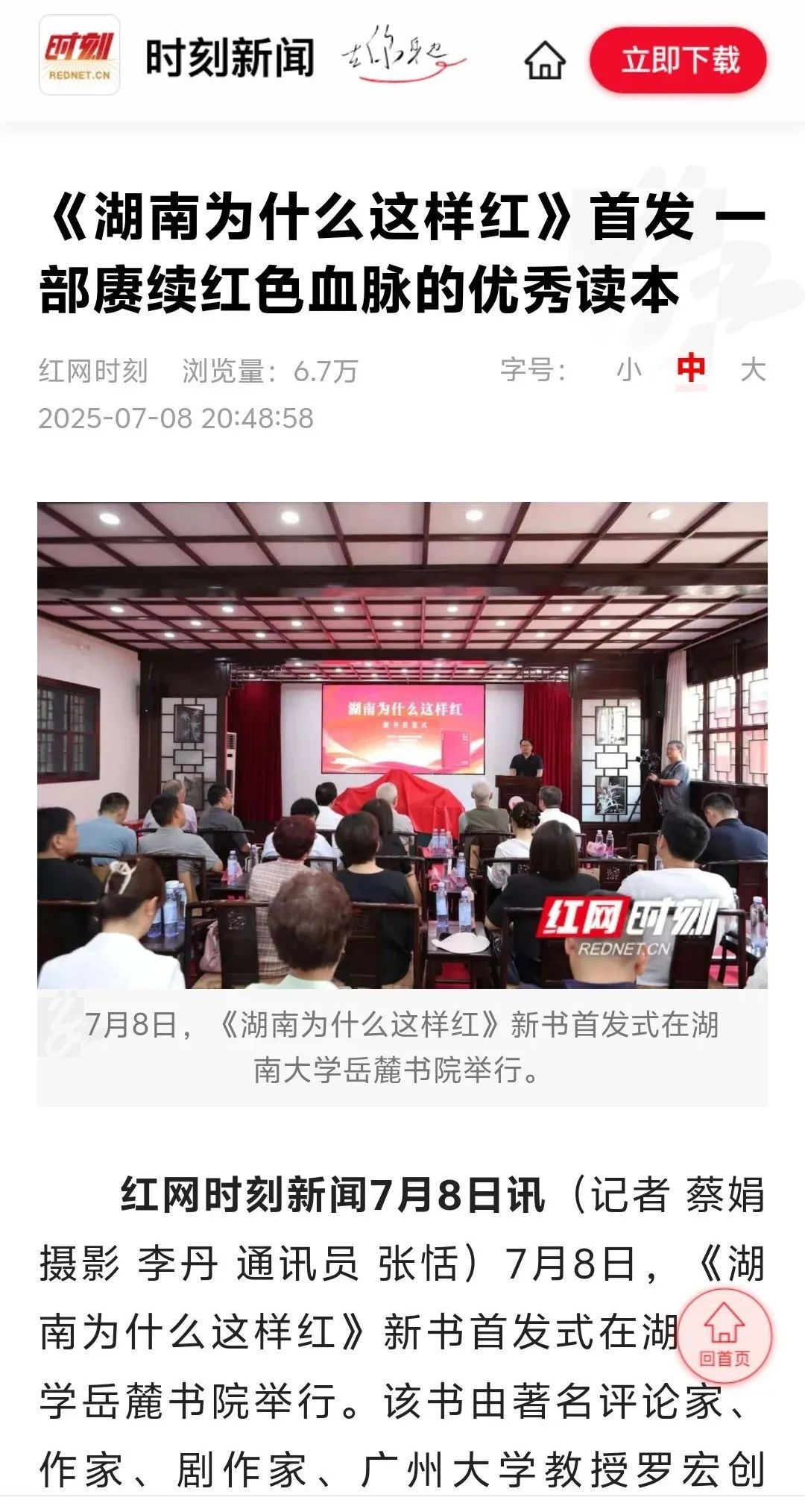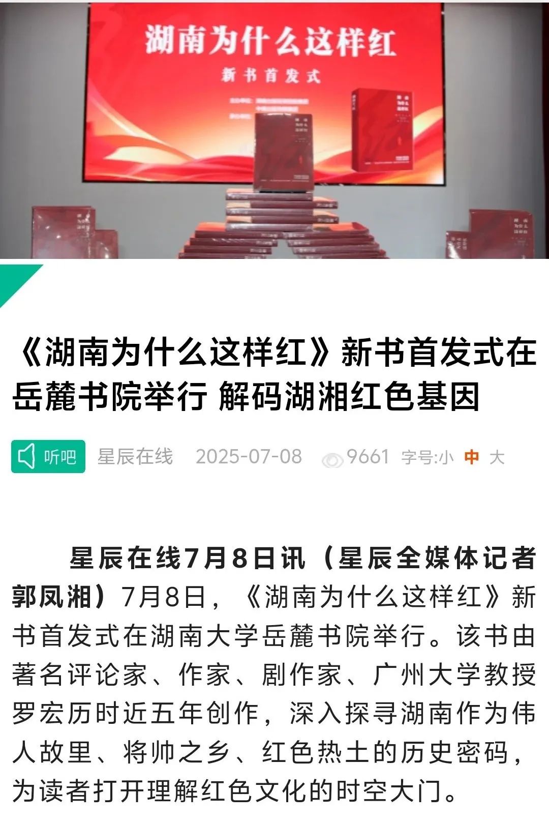 7月8日,《湖南为什么这样红》新书首发式在湖南大学岳麓书院举行。该书由著名评论家、作家、剧作家、广州大学教授罗宏创作,湖南人民出版社出版。会上,专家学者对《湖南为什么这样红》的出版给予了高度评价,一致认为该书立意角度新颖,聚焦湖南丰厚的革命历史资源,从历史纵深和文化根基出发,顺应推动湖湘文化创造性转化、创新性发展之势,系统探寻湖南为什么这样红的历史逻辑、理论逻辑与实践逻辑。该书不仅是湖南厚重革命文化的一个生动注解,更是加强革命传统和爱国主义教育、赓续红色血脉的一本鲜活教材。活动获得了《国际日报》、《湖南日报》、《南方日报》、湖南经视、红网、《潇湘晨报》、《长沙晚报》、星辰在线等国内外主流媒体的广泛报道。