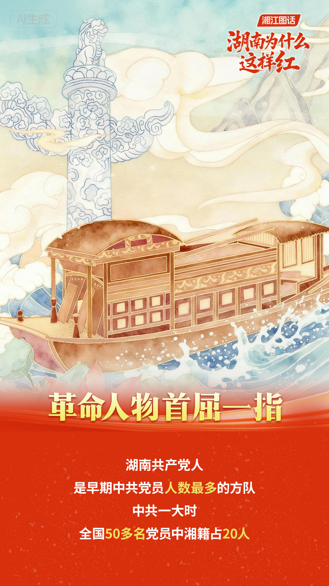 1921年7月23日,中国共产党第一次全国代表大会开幕。参加党的一大的党员共13人,代表着全国50多名党员。这50多名党员中,湘籍党员20人。湖南早期党组织成员数位列全国第四,而按照成员籍贯看,湖南党员人数最多。