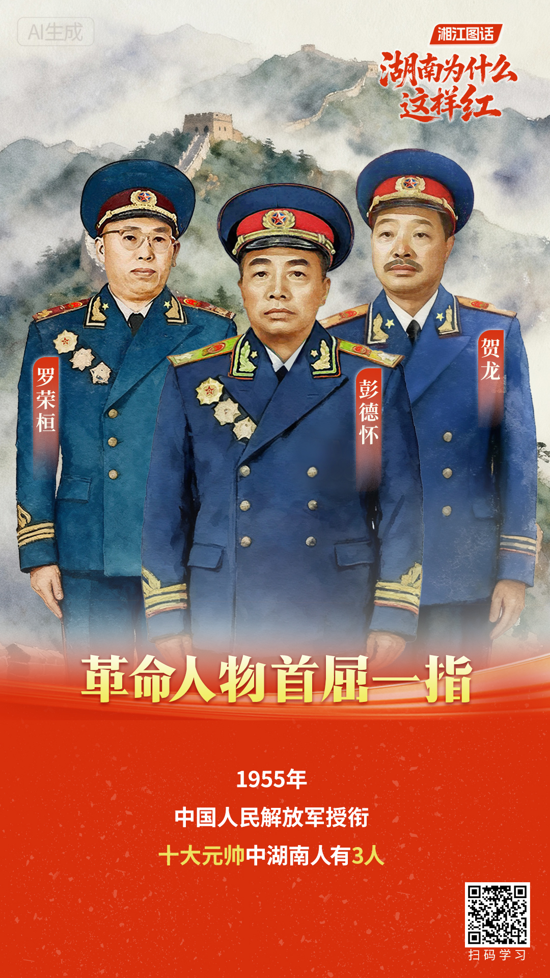 1955年,中国人民解放军授衔,十大元帅中湖南人有3人,分别是彭德怀(湘潭人)、贺龙(桑植人)、罗荣桓(衡山,今衡东人)。十位大将中湖南人有6人,分别是粟裕(会同人)、黄克诚(永兴人)、陈赓(湘乡人)、谭政(湘乡人)、萧劲光(长沙人)、许光达(长沙人)。57位上将中湖南人有19人,此外还有中将45人,少将129人。从籍贯看,湘籍元帅人数排名为全国第二,大将、上将、中将人数排名都是全国第一。这既体现了湖南人的军事才华,也体现了湖南人参与革命的程度以及对革命突出而独特的贡献。