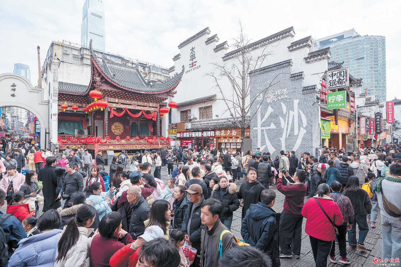 丰富多彩的活动也激发了商圈的活力。在黄兴南路步行商业街,游客摩肩接踵,周边的奶茶店、臭豆腐店等排起长队,边走边品尝美食的游客络绎不绝。在长沙国金中心、万象城、海信广场等商业中心,多家餐厅高朋满座,为春节增添了浓浓的烟火气。